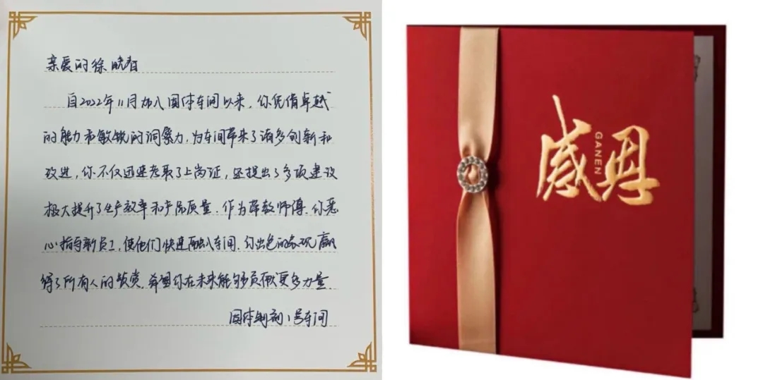 感謝卡:自2022年11月加入固體車間以來,你憑借卓越的能力和敏銳的洞察力,為車間帶來了諸多創(chuàng)新和改進(jìn),你不僅迅速考取了上崗證證,還提出了多項(xiàng)建議,極大提升了生產(chǎn)效率和產(chǎn)品質(zhì)量。作為帶教師傅,你悉心指導(dǎo)新員工,使他們快速融入車間。你出色的表現(xiàn)贏得了所有人的贊賞,希望你在未來能夠貢獻(xiàn)更多力量。