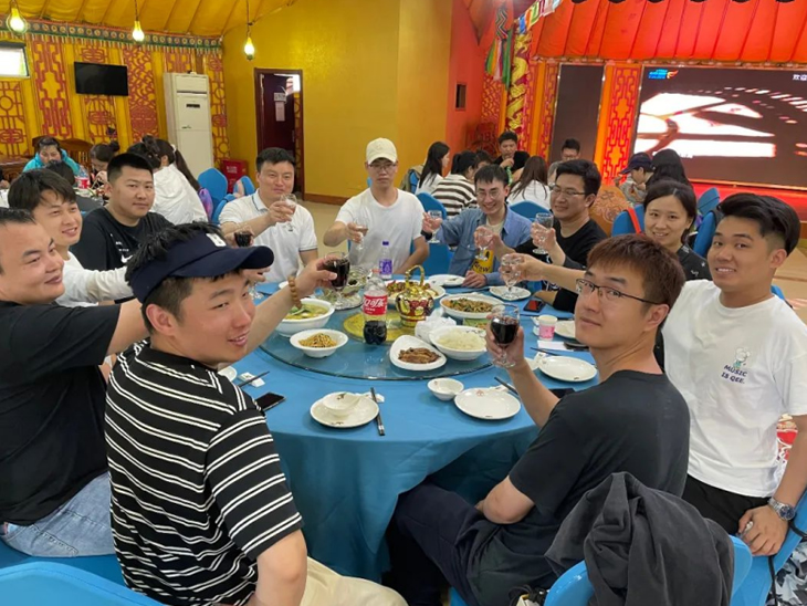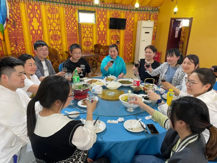 結(jié)束頒獎(jiǎng)后,一行人談笑風(fēng)生地步行前往“蒙古大營(yíng)”,走進(jìn)用餐區(qū),一個(gè)個(gè)或大或小的蒙古包映入眼簾,落日余暉下的風(fēng)景讓人深感民族特色。大家圍坐在桌旁,享用美味晚餐,幸運(yùn)的我們還觀賞到蒙古族歌曲、舞蹈、和馬頭琴的驚喜表演。